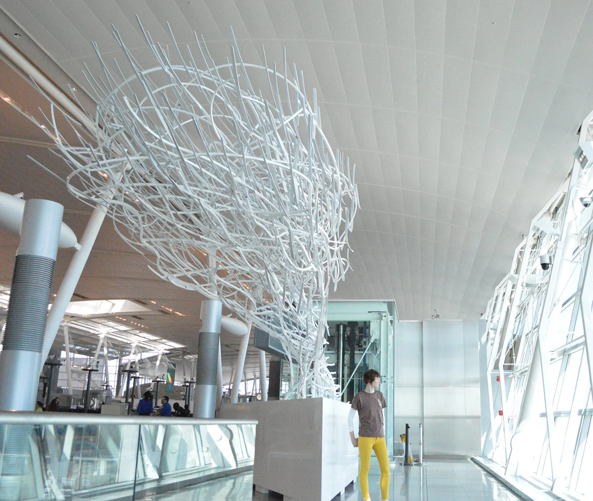 The sculpture was created without the aid of computer modeling; instead, Dimitar Lukanov built the piece entirely by hand, bending and joining the elements to scale by eye. The result is a breathless “drawing in space,” suspended between the diagonals of a sail, the cascading rhythm of a waterfall, and the arc of a bridge.