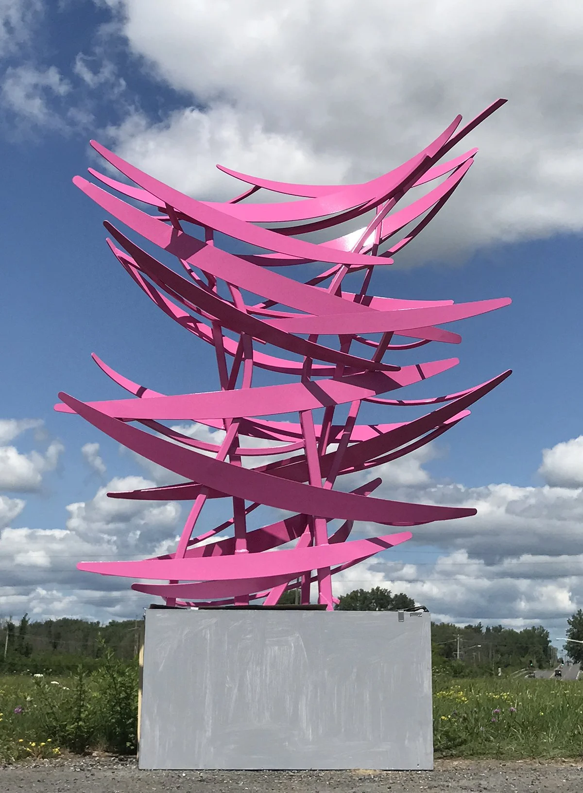 RiverDance is a buoyant sculpture with a color, accelerating her movement. A staccato of form in space, she is chronometrically choreographed in no-use-of-computer calculations of weight distribution and bent stainless steel tubing/elements.