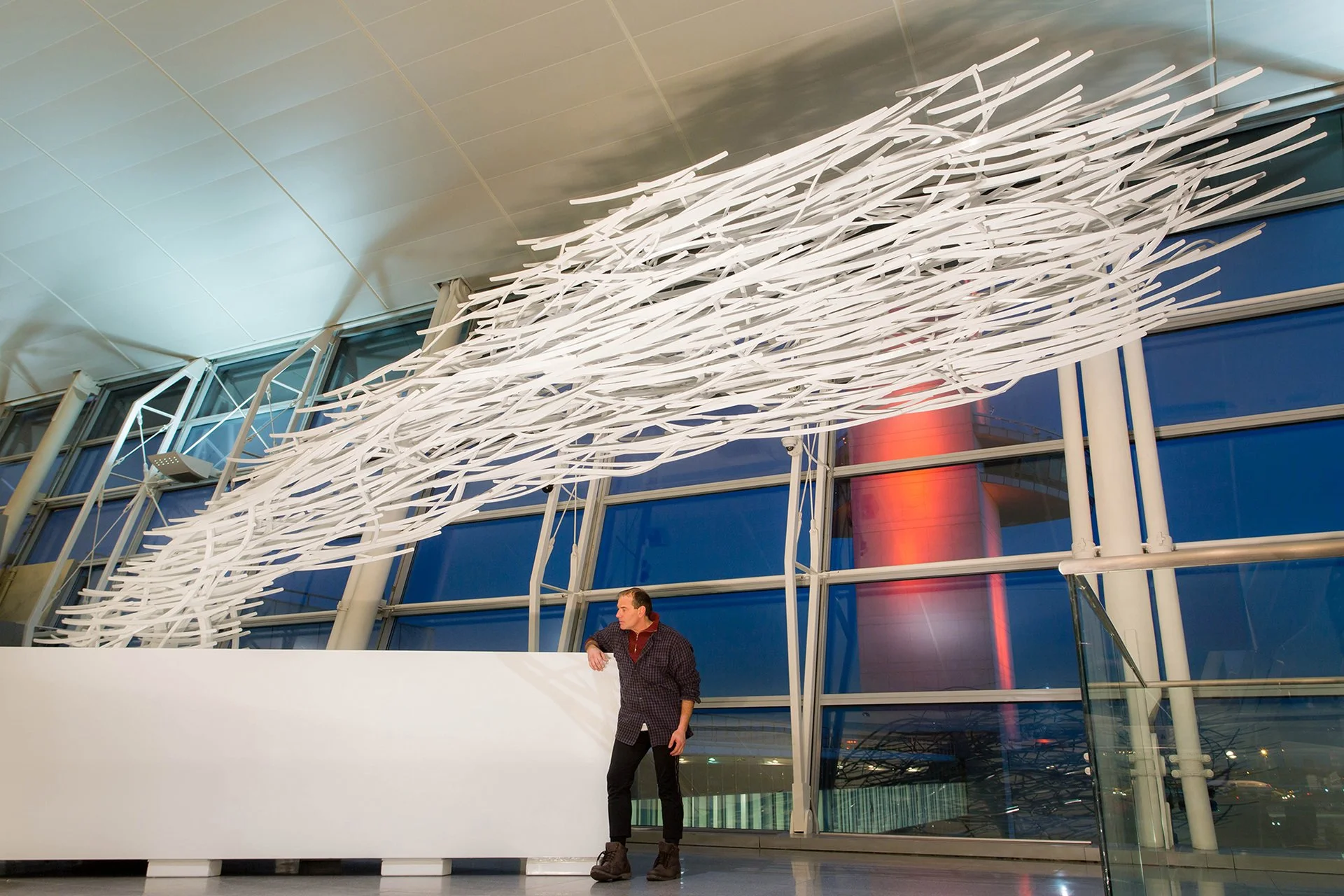 The sculpture was created without the aid of computer modeling; instead, Dimitar Lukanov built the piece entirely by hand, bending and joining the elements to scale by eye. The result is a breathless “drawing in space,” suspended between the diagonals of a sail, the cascading rhythm of a waterfall, and the arc of a bridge.