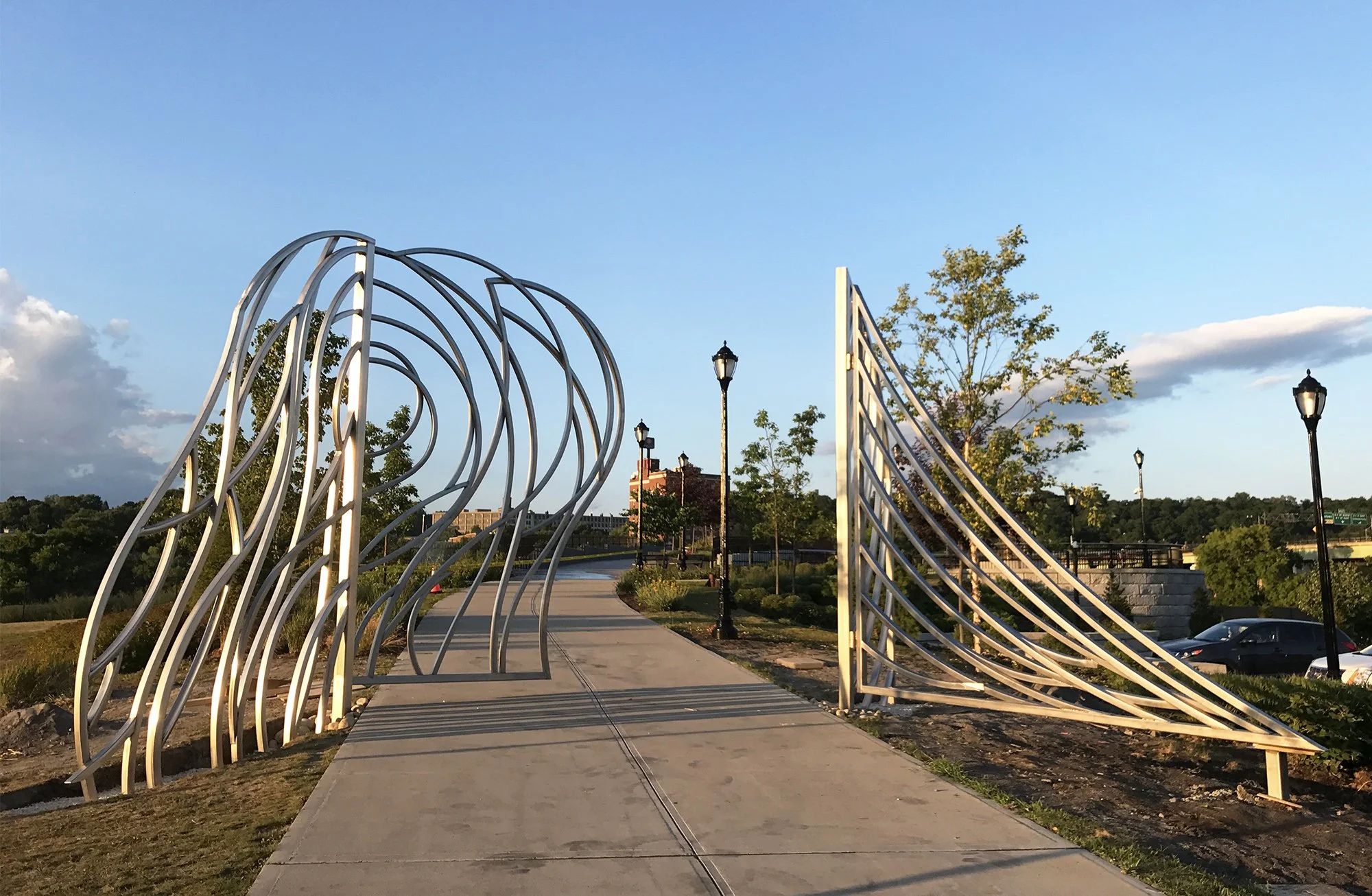 Installed on July 11, 2018, in Amsterdam, New York, “Entrance to Now” is a 15-foot filigree construction composed of nearly 4,000 pounds of bent stainless-steel tubing.